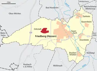 Im Vorfeld der Gebietsreform in Hessen wurde die Gemeinde Ockstadt am 31. Dezember 1971 im beiderseitigen Einvernehmen in die Stadt Friedberg eingegliedert.[7] Für Ockstadt wurde wie für jeden Stadtteil ein Ortsbezirk mit Ortsbeirat und Ortsvorsteher eingerichtet. Die Grenzen der Ortsbezirke folgen den seitherigen Gemarkungsgrenzen.
