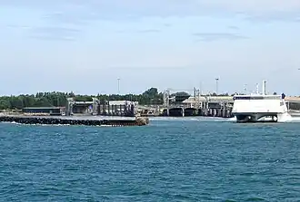 Das Hafenbecken wird durch zwei Molen vor der offenen See geschützt. Im Hafengebiet befinden sich das Abfertigungsgebäude, ein Öllager sowie eine Kläranlage zur Reinigung des Schmutzwassers von den Fähren. Von den Parkplätzen gelangen Kraftfahrzeuge über Rampen zu den Autofähren.[3]