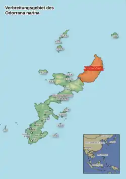 Das Verbreitungsgebiet liegt im äußersten Nordosten der Insel Okinawa in den Gemeinden Ōgimi, Kunigami und Higashi. Dort kommt Odorrana ishikawae bis 503 m Höhe vor. Ihr Lebensraum sind immergrüne Bergwälder, wo sie vor allem an Bächen zu finden sind.[3][1] Eine in ihrem Verbreitungsgebiet vorkommende Schwesterart ist Odorrana ishikawae.