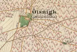 Im Dreißigjährigen Krieg wurde Oelsnig zerstört und blieb eine wüste Feldmark bis 1768. Schon 1647 hatte Wolf George von Loeben auf Schorbus und Auras Anna Margaretha von Kracht geheiratet; das Ehegeld wurde auf 600 Taler festgesetzt.[3] 1652 übernahm Wolf George die Güter Auras, Schorbus und Oelsnig alleine. Er leistete am 9./19. August 1657 auf dem Landtag in Lübben den Lehnseid gegenüber seinem neuen Lehnsherrn Christian I., Herzog des neugeschaffenen kursächsischen Sekundogeniturfürstentums Sachsen-Merseburg. Kurz davor oder danach muss seine Frau gestorben sein, denn Wolf George heiratete am 28. Juni 1658 Marie Elisabeth von der Heyde. Auch sie starb früh und Wolf George ging mit Sibylle Hedwig von Buxdorf noch eine dritte Ehe ein. Schon 1658 hatte Wolf George Schorbus an Georg von Werdeck verkaufen müssen, konnte aber Auras und Oelsnig behaupten. Oelsnig war aber völlig verlassen. Wolf George starb vor 1678, denn in diesem Jahr heiratete seine Witwe in zweiter Ehe den Georg Ernst von Muschwitz, mit dem sie den Sohn Wolf Nicol von Muschwitz hatte, der später Kemmen (bei Calau) erhielt. Nach dem Tod des Georg Ernst von Muschwitz ging Sibylle Hedwig von Buxdorf noch eine dritte Ehe mit Siegmund von Mosch ein. Die zwei Söhne des Wolf George d. Ä., Caspar Ernst und Wolf Georg d. J. wurden 1692 mit Auras und Oelsnig belehnt. 1694 teilten sie das väterliche Erbe; Wolf Georg übernahm Auras und Oelsnig, Caspar Ernst wurde mit 2.000 Talern in bar abgefunden. Nach dem Wechsel in monu dominate (Tod von Herzog Moritz Wilhelm, Inauguration von Heinrich) leistete er am 1. November 1731 erneut seinen Lehnseid. Sein Bruder Caspar Ernst war noch in die gesamte Hand aufgenommen; er leistete am 28. März 1732 seinen Lehnseid. Wolf George war mit Margarethe Dorothea von Lucke verheiratet, mit der er die Kinder Margarethe Elisabeth (* 1694), Johanna Gottliebe (* 1696), Erdmann Gottlob (* 1697), Wolf Georg (* 1699), Caspar Seyfried (* 1701), Gottlob Ehrenreich (* 1703) und Charlotte Tugendreich (* 1710) hatte. 1733 musste Wolf Georg von Loeben Auras und Oelsnig an Ehrenreich Friedrich von Britzke verkaufen. Er war mit Luise Christiane von Klitzing verheiratet. Mitbelehnt waren daher Carl Erdmann und Christian Friedrich von Klitzing. Auras und Oelsnig kamen nun in unterschiedliche Hände. 1762 oder 1766 verkaufte Ehrenreich Friedrich von Britzke Oelsnig an Johann Gottfried Raack, Auras ging in der Versteigerung an die Predigerwitwe Anna Margarethe Krüger, geb. Riemann. Das Dorf war nach seiner Zerstörung im Dreißigjährigen Krieg nicht wieder aufgebaut worden. Die Feldmark wurde von Auras ausgenutzt. Erst Johann Gottfried Raack (oder Hermann Gottfried Raack * 1728, † 1822[4]) baute hier 1768 wieder ein Vorwerk auf. 1777 wohnten fünf Personen im Ort. 1810 wohnten hier bereits wieder fünf Häusler- oder Büdnerfamilien. Für 1818 werden 8 Häuser angegeben, in denen 66 Einwohner lebten. Außerdem wird die Oelsniger Ziegelei genannt.[5] Johann/Hermann Gottfried Raack war mit Johanna Elisabeth Benade (* 1730, † 1803) verheiratet, Tochter des Pastor Primarius und Ritter des Roten Adlerordens 3. Klasse Johann Friedrich Benade zu Hoyerswerda.[6] 1823 übernahm der Sohn Johann Gottlieb Raack das Gut. 1850 wird als Besitzerin dessen Tochter Christiane Henriette erwähnt, die mit Karl Friedrich Jaenicke verheiratet war. 1840 nennt ihn die Topographische Übersicht als Besitzer.[7] Die Zahl der Häuser war auf zehn gestiegen, die Zahl der Einwohner auf 69.[7] Rauer bezeichnet Christiane Henriette geb. Raack dann schon 1857 als Witwe.[8], ebenso Riehl und Scheu.[9] Schon vor 1864 hatte sie das Rittergut an Wilhelm Hirsekorn verkauft.[10] Damals hatte der kleine Ort schon 11 Häuser und 82 Einwohner. Außerdem gab es eine Schäferei und eine Ziegelei. Das Rittergut Oelsnig umfasste damals 1468 Morgen (250 Morgen Ackerland und 979 Morgen Forst). Das Rittergut wurde 1867 in Eigen umgewandelt. 1869 umfasste der sehr kleine Gemeindebezirk nur 42 Morgen, der Gutsbezirk dagegen 1468 Morgen. 1885 war Ernst Hemprich Besitzer des Rittergutes. Die Größe wird dabei mit 375 ha angegeben, davon 107 ha Ackerland, 12 ha Wiesen und 256 ha Forst. Die Grundsteuer betrug 1.732 Mark. 1896 und 1907 hieß der Besitzer Hermann Dittrich aus Oberfrohna. Die Größe des Rittergutes wird nun mit 382 ha beziffert, davon waren 80 ha Ackerland, 3 ha Wiesen und 294 ha Forst. 1900 hatte der Gemeindebezirk 11 ha, der Gutsbezirk 382 ha. 1910 hatte bereits der Sohn Robert Julius Dittrich das Gut übernommen;[11] er ist auch noch 1929 auf Oelsnig nachgewiesen.
