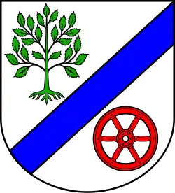 Blasonierung: „In Silber ein breiter blauer Schräglinksbalken, begleitet oben von einem bewurzelten grünen Laubbaum, unten von einem sechsspeichigen roten Wagenrad.“[3]