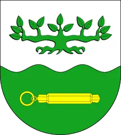 Blasonierung: „Von Silber und Grün im Wellenschnitt geteilt. Oben eine grüne Knickharfe, unten ein goldener Bauernstock in der Form eines achtkantig geschmiedeten, mit verjüngten Knöpfen abschließenden Eisenstabes, durch dessen vorderes Ende ein Ring gezogen ist.“[5]