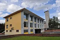 Die Schule wurde ab 1952 nach Plänen von Stadtbaurat Adolf Bayer im typischen Nachkriegsstil erbaut. Zusammen mit der 1955 im gleichen Stil erbauten benachbarten Heilig-Kreuz-Kirche steht der Komplex unter Denkmalschutz.[6]