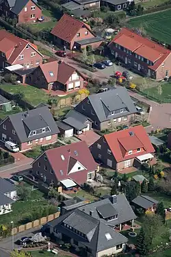 - Hausgruppe: Aus mindestens drei aneinandergebauten Häusern (beispielsweise Reihenhäusern) bestehend, die sich jeweils auf eigenen Grundstücken befinden. Die Hausgruppe muss als Ganzes an den Kopfenden einen Abstand zu den Nachbargrenzen einhalten.