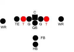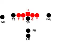 Im American Football müssen immer mindestens sieben Spieler an der Line of Scrimmage stehen,[1] von denen nur die äußeren beiden einen Ball fangen dürfen (siehe Skizze: Der Tight End und der rechte Wide Receiver stehen wie die Linemen an der Line, während der linke Receiver nach hinten versetzt aufgestellt ist). Diese „passberechtigten“ Spieler sind jedoch niemals die Linemen, auch wenn sie außen an der Linie stehen, sondern entweder Tight Ends oder Wide Receiver. Die Offensive Line muss dabei „Blockarbeit“ leisten, das heißt, ankommende Gegner der Defense vom Tackeln abhalten. Es darf vonseiten der Offensive Line auch nur geblockt werden, alles andere – also Festhalten oder Ähnliches – ist verboten und wird bestraft. Außerdem dürfen Offensive Linemen auch keine Vorwärtspässe berühren (es sei denn, der Pass wurde bereits vorher durch einen sogenannten „berechtigten Passempfänger“ berührt), weshalb sie jene Spieler sind, die mit Abstand am seltensten in Ballbesitz kommen (wenn doch, dann aufgrund eines Fumbles oder eines Lateralpasses). Sie tragen immer Nummern zwischen 50 und 79 (diese Nummern signalisieren in der Offense, dass die Spieler nicht passberechtigt sind).