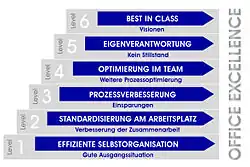 Im ersten Schritt verbessern die Mitarbeiter die Ordnung in den Büros und entwickeln einen Blick für Verschwendung und Wertschöpfung. Office Excellence bedient sich in der weiteren Optimierung kleiner systematischer Methodenpakete, die in einem 6 Level-Modell abgebildet werden. In jedem Level werden Schritt für Schritt die Potenziale aufgedeckt, die Mitarbeiter beginnen am eigenen Arbeitsplatz um dann in jedem folgenden Level mit umfangreicheren Themen in den übergreifenden Prozessen weiterzumachen.