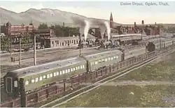 Als erster Bahnhof in Ogden wurde ein kleines, zweistöckiges Gebäude am Ufer des Weber River genutzt, das 1860 gebaut worden war. Die Anlage wurde schnell unzureichend, so dass die Union Pacific Railroad und die Central Pacific Railroad 1889 gemeinsam eine viel größere Union Station aus Ziegelstein und einen zentralen Uhrturm bauten. Im Jahr 1866 wurde die Telegrafenlinie von Salt Lake City nach Ogden verlängert.[15] Die Grand Station wurde am 31. Dezember 1889 eingeweiht und umfasste 33 Hotelzimmer, ein Restaurant sowie einen Friseursalon. Am 13. Februar 1923 entstand in einem der Hotelzimmer Feuer und breitete sich schnell auf den Bahnhof aus. Niemand wurde verletzt oder getötet, aber die Gebäude mussten vollständig erneuert werden. John und Donald Parkinson, Geschäftsführer eines Architekturbüros in Los Angeles, entwarfen den Neubau. Am 8. April 1924 fiel die letzte alte Mauer und enthüllte eine intakte, kupferne Box mit historischen Materialien der 1880er-Jahre. Die große Halle wurde 1924 fertiggestellt. In den 1960er-Jahren verringerte sich aufgrund der zunehmenden Nutzung des Automobils, der Autobahnen und des Flugverkehrs der Personenverkehr auf der Schiene landesweit und auch in Ogden.[17]