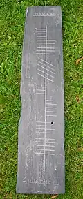 Auf einer Schieferplatte aus dem Jahr 2011 ist der Vorname COURTNEY eingeritzt. Da Y im Ogham-Alphabet nicht vorhanden ist, wurde es durch I ersetzt. Die Leserichtung verläuft von oben nach unten.