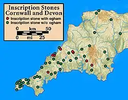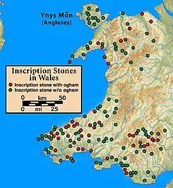 Etwa 35 Steine wurden in Wales, vier in Cornwall (Worthyvale) und zwei in der südenglischen Grafschaft Devon gefunden. Der Fardel-Stein und der Oghamstein von Silchester stammen aus England.[3] Sechs Oghamsteine stammen von der Isle of Man (z. B. Oghamstein von Speke Keeill), Dutzende mit piktischer Inschrift und drei mit gälischer Inschrift stammen aus Schottland. Die Authentizität der drei Letztgenannten wurde jedoch angezweifelt.