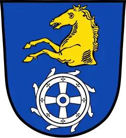 Blasonierung: „In Blau über einem silbernen Schöpfrad ein goldener Pferderumpf.“[10] |