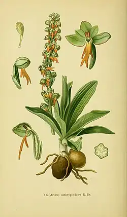 - ×Orchiaceras meilsheimeri (Rouy) P.Fourn. (Syn.: Orchis × macra Lindl.) = Orchis anthropophora × Orchis purpurea