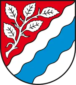 Blasonierung: „Schräglinksgeteilt durch Wellenschnitt Rot über Silber, oben ein fünfblättriger silberner Buchenzweig, unten ein blauer Wellenschräglinksbalken.“