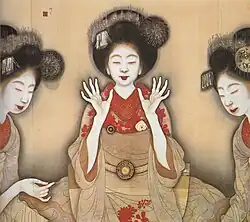 - ↑ Teiten (帝展) ist die Abkürzung für die jährliche staatliche Kunstausstellung (帝国美術展覧会, Teikoku bijutsu-in tenrankai) zwischen 1919 und 1935. Die Vorgängerin von 1907 bis 1918 hieß Bunten (文展) für Mombushō bijutsu tenrankai (文部省美術展覧会), die Nachfolgerin von 1936 bis 1944 wurde ein Shin (新) für „Neu“ vorgesetzt. Die Nachfolgerin ab 1946, nun nicht mehr staatlich, hieß kurz Nitten für (日本美術展覧会, Nihon bijutsu-in tenrankai).