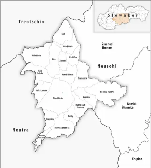 Historisch gesehen liegt der Bezirk zum größten Teil im ehemaligen Komitat Bars, ein kleiner Teil im Osten östlich des Ortes Hodruša-Hámre gehört zum ehemaligen Komitat Hont (siehe auch Liste der historischen Komitate Ungarns).