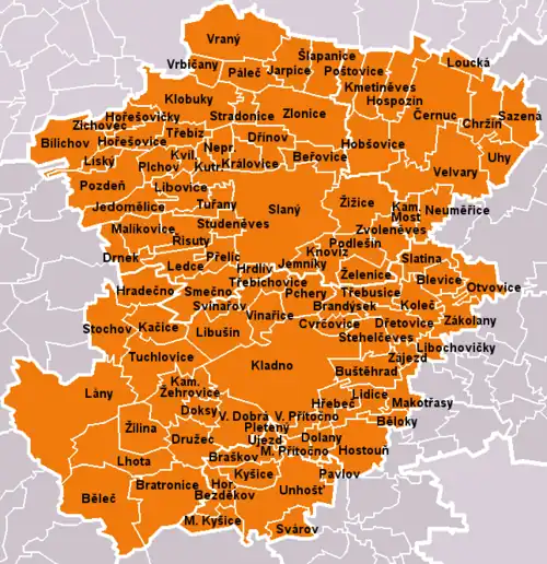 Běleč – Běloky – Beřovice – Bílichov – Blevice – Brandýsek – Braškov – Bratronice – Buštěhrad – Černuc – Cvrčovice – Doksy – Dolany – Drnek – Družec – Dřetovice – Dřínov – Hobšovice – Horní Bezděkov – Hořešovice – Hořešovičky – Hospozín – Hostouň – Hradečno – Hrdlív – Hřebeč – Chržín – Jarpice – Jedomělice – Jemníky – Kačice – Kamenné Žehrovice – Kamenný Most – Kladno – Klobuky – Kmetiněves – Knovíz – Koleč – Královice – Kutrovice – Kvílice – Kyšice – Lány – Ledce – Lhota – Libochovičky – Libovice – Libušín – Lidice – Líský – Loucká – Makotřasy – Malé Kyšice – Malé Přítočno – Malíkovice – Neprobylice – Neuměřice – Otvovice – Páleč – Pavlov – Pchery – Pletený Újezd – Plchov – Podlešín – Poštovice – Pozdeň – Přelíc – Řisuty – Sazená – Slaný – Šlapanice – Slatina – Smečno – Stehelčeves – Stochov – Stradonice – Studeněves – Svárov – Svinařov – Třebichovice – Třebíz – Třebusice – Tuchlovice – Tuřany – Uhy – Unhošť – Velká Dobrá – Velké Přítočno – Velvary – Vinařice – Vraný – Vrbičany – Zájezd – Zákolany – Želenice – Zichovec – Žilina – Žižice – Zlonice – Zvoleněves