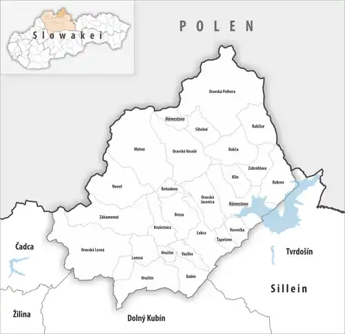Historisch gesehen liegt der Bezirk vollständig im ehemaligen Komitat Arwa (siehe auch Liste der historischen Komitate Ungarns). In der Verwaltungsgliederung der Tschechoslowakei in den Jahren 1960–1990 war er Teil des Okres Dolný Kubín, innerhalb des Stredoslovenský kraj (Mittelslowakischer Landschaftsverband).