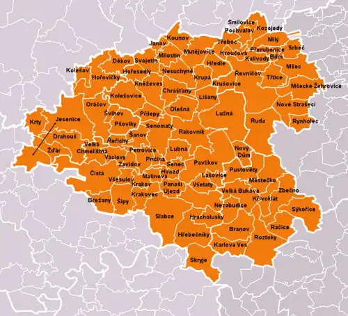 Bdín (Bdin) – Branov (Branow) – Břežany (Breschan) – Čistá (Tschistay) – Chrášťany (Kroschau) – Děkov (Dekau) – Drahouš (Drahuschen) – Hořesedly (Horosedl) – Hořovičky (Deutsch Horowitz) – Hracholusky (Hracholusk) – Hřebečníky (Hrzebecznik) – Hředle – Hvozd (Tiefenhain) – Janov (Johannesthal) – Jesenice (Jechnitz) -Kalivody (Kaliwod) – Karlova Ves (Karlsdorf) – Kněževes (Herrndorf) – Kolešov (Koleschau) – Kolešovice (Koleschowitz) – Kounov (Kaunowa) – Kozojedy (Kosojed) – Krakov (Krakau) – Krakovec (Rothschloß) – Kroučová – Krty (Gerten) – Krupá – Krušovice (Kruschowitz) – Křivoklát (Pürglitz) – Lašovice (Laschowitz) – Lišany – Lubná – Lužná (Luschna) -Malinová (Beerenheid) – Městečko (Stadtl) – Milostín – Milý – Mšec – Mšecké Žehrovice (Kornhaus Scherowitz) – Mutějovice (Mutowitz) – Nesuchyně (Nesuchin) – Nezabudice (Nesabuditz) – Nové Strašecí (Neustraschitz) – Nový Dům (Neuhaus) – Olešná (Woleschna) – Oráčov (Woratschen) – Panoší Újezd (Panasch Aujest) – Pavlíkov (Pawlikow) – Petrovice (Petrowitz) – Pochvalov – Přerubenice (Przerubenitz) – Příčina (Pritschina) – Přílepy (Przilep) – Pšovlky (Pschoblik) – Pustověty (Pustowied) – Račice (Ratschitz) – Rakovník (Rakonitz) – Roztoky (Rostok) – Ruda – Rynholec – Řeřichy (Röscha) – Řevničov – Senec (Senetz) – Senomaty (Senomat) – Skryje (Skrei) – Slabce (Slabetz) – Smilovice – Srbeč (Serbetsch) – Svojetín – Sýkořice (Sikorschitz) – Šanov (Schanowa) – Šípy (Schippen) – Švihov (Schmihof) – Třeboc (Trebotz) – Třtice – Václavy (Wazlaw) – Velká Buková (Groß Bukowa) – Velká Chmelištná (Groß Chmelischen) – Všesulov (Schlösselhof) – Všetaty (Wschetat) – Zavidov (Seiwedl) – Zbečno (Sbetschno) – Žďár (Schaar)