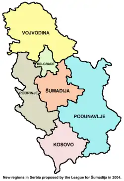 Zur Region Šumadija gehört außer dem Bezirk Šumadija auch der südliche Teil des Okrug Belgrad mit den Gemeinden Barajevo, Lazarevac, Mladenovac und Sopot. Ferner werden folgende Gemeinden zur Region Šumadija gezählt: