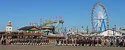 Vergnügungsangebote und Attraktionen wie Karusselle, Schaukeln und Schießstände gab es bereits bei den frühen Oktoberfesten. Seit den 1870er Jahren entwickelte sich das Schaustellergewerbe rasant. Ab den 1890er Jahren versteigerte der Stadtmagistrat aufgrund der hohen Nachfrage die Plätze für Fahrgeschäfte. Daneben gab es viele neue Attraktionen und das Bild des Oktoberfestes wurde „von Völker- und Abnormitätenschauen, von Wachsfigurenkabinetten, Museen, Varieté- und Zaubertheatern, Panoramen und Menagieren bestimmt, und überall hier setzten die Veranstalter auf den Reiz der Exotik“.[18] Neben Vorführungen exotischer Tiere (bis 1911 gab es in München keinen Zoo) wurden besonders die Völkerschauen zu einem lukrativen Unterhaltungsgeschäft. Die erste dieser Völkerschauen auf dem Oktoberfest war die 1879 von Carl Hagenbeck veranstaltete „Nubier-Schau“.[19] Von den 1890er Jahren bis 1931 fanden regelmäßig solche Schauen statt, wie etwa die Buffalo-Bill-Show 1892 oder das von Carl Gabriel organisierte „Beduinen-Lager“ im Jahr 1901. In den folgenden Jahren zeigte Gabriel weitere große Schauen und kooperierte dabei mit den Hagenbecks, so etwa bei der „Riesenvölkerschau“ 1909.[20] Die letzte Völkerschau auf dem Münchner Oktoberfest vor dem Zweiten Weltkrieg fand 1931 unter dem Namen „Kanaken der Südsee“ statt.[21] Nach dem Krieg gab es noch vereinzelt Völkerschauen; die letzte war „Feldl's Völkerschau Hawaii“ im Jahr 1959, bei der etwa 150 Personen zur Schau gestellt wurden.[22]