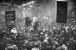 - Dieser Petrograder Sowjet, der Arbeiter- und Soldatenrat der Hauptstadt, war gleich zu Beginn der Februarrevolution spontan von Aufständischen gebildet worden und beanspruchte ebenfalls legislative Macht. Er trat in der Verfassungsfrage für ein Rätesystem ein. Als ausführende Organe schuf er ein Exekutivkomitee, das im Juni 1917 durch den Beitritt von Delegierten aus anderen Teilen Russlands zum 1. Allrussischen Zentralen Exekutivkomitee erweitert wurde. Hier dominierten zunächst die agrarsozialistischen Sozialrevolutionäre und die gemäßigt-marxistischen Menschewiki, das Exekutivkomitee war eine Stütze der Provisorischen Regierung.[3] Beide Organe tagten im Taurischen Palais.