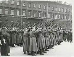 Pro forma sollte das MRK die Verteidigung der Stadt gegen eine Konterrevolution vorbereiten, in Wahrheit diente es dazu, die Verlegung revolutionärer Truppen an die Front zu vereiteln, die Kerenski wenige Tage vorher angeordnet hatte. Die Soldaten sahen darin keinen Beitrag zur Vaterlandsverteidigung, sondern den Versuch, revolutionäre Elemente aus Petrograd zu entfernen. So wurde aus dem MRK das Instrument der militärischen Machtergreifung der Bolschewiki.[40] Die Truppen beschränkten sich auf etwa 15.000 bis 20.000 Soldaten der Petrograder Garnison und der Kronstädter Marine, die sich dem Militärisch-Revolutionären Komitee unterstellt hatten, den Roten Garden sowie wenigen Hundertschaften aus den Arbeiterkomitees stammender, militanter Bolschewiki.[41] Nach anderen Angaben verfügten sie nur über 6.000 Mann.[42]