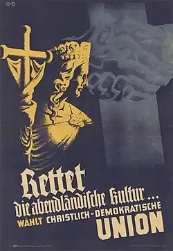 Nach dem Zweiten Weltkrieg gewann die Abendlandidee in Westdeutschland zeitweise an erheblichem Einfluss. Konservativ-bürgerliche Werte sollten nach der Katastrophe der Hitler-Diktatur hier eine neue Verankerung finden und sowohl gegen die als seelenlos und individualistisch bezeichnete Moderne westeuropäischer oder amerikanischer Prägung in Stellung gehen als auch gegen den Kollektivismus und Totalitarismus der Sowjetunion. Auch von der als nihilistisch verstandenen eigenen nationalsozialistischen Vergangenheit grenzte die Abendlandideologie sich ab. Die katholische Publizistik warb unter dem Schlagwort „Wiedergewinnung der abendländischen Kultur“ für eine Rechristianisierung der deutschen Gesellschaft.[2] In diesem Sinne bekannte sich Bundeskanzler Konrad Adenauer in seiner ersten Regierungserklärung am 20. September 1949 ausdrücklich zum „Geist christlich-abendländischer Kultur“ als Fundament seiner Kanzlerschaft.[10]