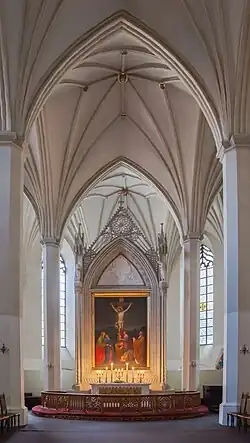 Das Altarbild zeigt Christus am Kreuz vor dem verdunkelten Himmel[2] sowie sechs Gestalten der Passionsgeschichte, die um ihn trauern. Es wurde 1831–1833 vom deutsch-baltischen Künstler Wilhelm von Kügelgen im Nazarenerstil gemalt.[3]