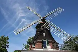 Die unter Denkmalschutz stehende Holländerwindmühle (Lage:54,38718° N, 8,97579° O) wurde 1786 als Erdholländer-Mühle erbaut. 1886 wurde die Mühle aufgestockt. Dabei wurde der hölzerne Aufbau an Flaschenzügen hochgezogen, um darunter einen Mauerwerksockel zu errichten. Die Mühle Catharina ist damit eine Bergholländermühle. Erst in den 1970er Jahren wurde der Mahlbetrieb eingestellt.[13] Nach der Restaurierung wird sie als Ferienhaus genutzt. Durch das Sturmtief Herwart wurden in der Nacht zum 29. Oktober 2017 die drehbare Haube mit Flügelkreuz abgerissen.[14] Im Juni 2018 wurde die wiederhergestellte neue Haube aufgesetzt und ein neues Flügelkreuz angebracht.[15] Seit dem Wiederaufbau ist die neue Haube festgesetzt worden und ist somit nicht mehr drehbar.