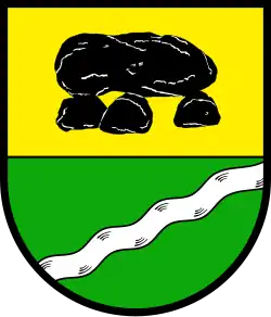 Blasonierung: „Von Gold und Grün geteilt. Oben ein aus drei Tragsteinen und einem Deckstein bestehendes schwarzes Steingrab, unten ein schräglinker silberner Wellenbalken.“[7]