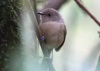 Dieser kleine Vangawürger ist etwa 12 cm groß, 9–18 g schwer und ähnelt eher den Grasmücken. Die Oberseite ist olivbraun mit einfarbigem Kopf, dunklem Schnabel und blass-brauner, dunkel wirkender Iris. Die Unterseite ist dunkel graubraun, die Beine heller grau. Der Jungvogel ist durchgehend rostbraun mit dunkler Iris.[4][5]