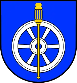 Blasonierung: „In Blau ein silbernes Pflugrad, belegt mit einem goldenen Pilgerstab.“ |