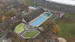 Die 1935 errichtete Anlage besteht aus einem 50 Meter × 21 Meter großen Schwimmbecken, einem 20 Meter × 20 Meter großen Sprungbecken mit 10-m-Sprungturm, zwei Nichtschwimmerbecken und anschließender Liegewiese. Seitlich der beiden Hauptbecken stehen zwei Zuschauertribünen mit 7.600 Plätzen, die zu den Olympischen Spielen 1936 durch hölzerne Zusatztribünen auf insgesamt 18.500 Plätze erweitert wurden. Unterhalb der Tribünen befinden sich Umkleidekabinen, sanitäre Anlagen und technische Einrichtungen. Die Tribünen sind sanierungsbedürftig und für Besucher gesperrt.