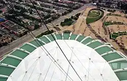 Das Gesamtbild des Stadions wird durch den 175 Meter hohen schrägen Turm geprägt; der Neigungswinkel beträgt abhängig vom Bezugspunkt (die Neigung steigt mit der Höhe des Turms, da der Turm eine gebogene Form aufweist) zwischen 23 und 81 Grad.[19] Der Turm war wegen technischer Probleme bis zu den Olympischen Spielen 1976 nicht fertig, der unvollendete Turmstumpf überragte knapp die Höhe des Stadionbaus. Fertiggestellt wurde er erst 1987. Eine Seilbahn befördert in verglasten Doppeldecker-Gondeln Besucher bis zur 166 Meter hohen Aussichtsplattform hinauf. Auf der Spitze des Turmes befindet sich der Salon Montréal, der bis zu 240 Personen aufnehmen kann.[20]