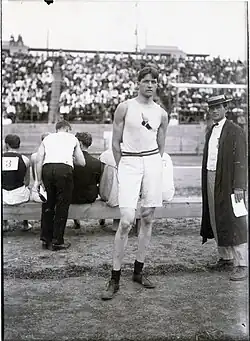 Lawson Robertson, Bronzemedaillengewinner im Standhochsprung und vermutlich auch Teilnehmer beim Standweitsprung, über 100 Meter auf Rang sechs