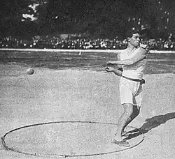 Ralph Rose (hier beim Kugelstoßen) trat auch im Hammerwurf an und schied mit 42,58 m im Vorkampf aus, Gesamtrang acht