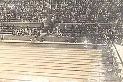 45 Minuten Deutsche Leibesübungen war eine sportliche Großveranstaltung am 9. August 1936 im Berliner Olympiastadion.[10][11][12] Insgesamt 4000 deutsche Turnerinnen und Turner vollführten am Vorabend der olympischen Turnwettkämpfe[13] ein Massen-Schauturnen.[14] Es wurden Freiübungen, Keulenschwingen und Ballspiele geboten. Die Präsentation integrierte u. a. eine „Körperschule“ der Männer, Gymnastik und Tänze von Frauen unter der Regie von Carl Loges.[15] Meisterturner aus Hamburg und Berlin zeigten u. a. Vorführungen an den Ringen. Die Hamburger Turner hatten sich in einem Ausscheidungsturnen am 6. Juli 1936 qualifiziert.[16] Außerdem zeigten der vierfache Olympiasieger von 1896 Carl Schuhmann und eine Altersriege drei Übungen.
