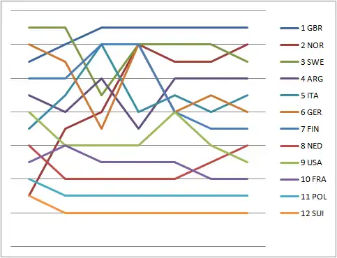 | Rang | Land | Crew | Yachtname | Rennen I | Rennen II | Rennen III | Rennen IV | Rennen V | Rennen VI | Rennen VII | Gesamt | |||||||