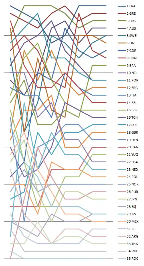 | 14 | Jacques Rogge | 3 | 5,7 | 24 | 30,0 | 16 | 22,0 | 12 | 18,0 | 11 | 17,0 | 19 | 25,0 | 158,7 | 117,7 | |||