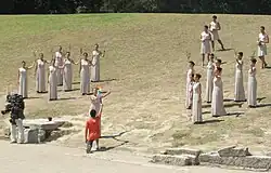 Einige Monate vor den Spielen wird an historischer Stätte in Olympia in einer an antike Rituale angelehnten Zeremonie die olympische Fackel entzündet. Eine als Priesterin verkleidete Schauspielerin entfacht die Fackel mittels eines Parabolspiegels und übergibt sie dem ersten Läufer des anschließenden Staffellaufs. Dieser Lauf führt von Olympia bis zum Hauptstadion der jeweiligen Gastgeberstadt, wo die Flamme während der Dauer der Veranstaltung brennt.[26] Das erste Mal wurde bei den Sommerspielen 1928 in Amsterdam ein olympisches Feuer entzündet. Es gab jedoch damals weder einen Fackellauf vor der Eröffnungsfeier, noch wurde das Feuer von einer bestimmten Person entzündet. Nach einer Idee von Carl Diem fand der erste Fackellauf vor den Sommerspielen 1936 in Berlin statt, 1952 in Oslo der erste Fackellauf anlässlich von Winterspielen.[25]