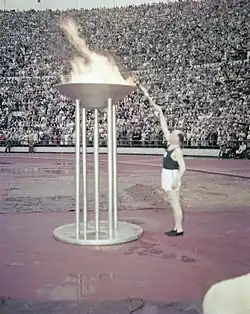 Der Höhepunkt einer Eröffnungsfeier ist jeweils das Entzünden des olympischen Feuers, hier Paavo Nurmi 1952 im Olympiastadion von Helsinki