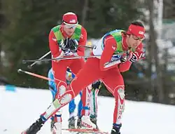 Johnny Spillane (vorne) und Todd Lodwick beim Wettbewerb von der Normalschanze bei den Olympischen Winterspielen 2010