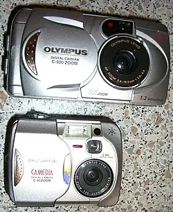 Mit der CAMEDIA (CAMERA DIGITAL) C-400 und C-400L stieg Olympus 1996 in die Kompaktklasse der Digitalkameras ein. Sie boten mit ihren 1⁄3-Zoll-CCD-Sensoren eine Auflösung von 640 × 480 Pixeln und besaßen ein 36-mm-Objektiv (bezogen auf 35-mm-Kameras).[25] 2003 erschien die µ-10 DIGITAL. Die geschwungenen Linien ihres wetterfesten Metallgehäuses hatte sie von ihren analogen Vorgängerinnen übernommen. Das Design der µ-Digitalkameras hat sich im Laufe der Jahre teilweise gewandelt, geblieben ist aber ihre Popularität dank ihrer nach wie vor einfachen Handhabung. Alle Kameras haben ein wetterfestes Gehäuse. Die µ-tough-(SW)-Modelle sind sogar zwischen drei und zehn Meter wasserdicht und außerdem stoßfest. Die SP-Serie mit den UltraZoom-Kameras bietet starke Tele- beziehungsweise Weitwinkel-Teleobjektive.[26]