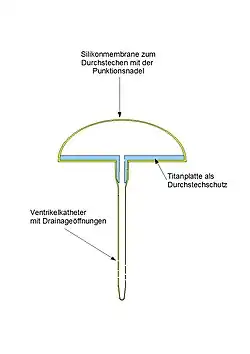Das Ommaya-Reservoir besteht aus einem kleinen kissenförmigen Kunststoff-Behälter, der unter der Kopfhaut (subgaleal) liegt. Das Reservoir wird in einer kurzen neurochirurgischen Operation unter die Kopfhaut implantiert, so dass der Katheter ins Vorderhorn des Seitenventrikels der nicht dominanten Hemisphäre gelegt werden kann.[1] Ein dünner Schlauch, der Ventrikelkatheter, der mit dem Reservoir verbunden ist, reicht in einen mit Liquor gefüllten Hohlraum (ein Ventrikel) hinein. Über eine dünne Kanüle kann das Reservoir angestochen werden. Dabei kann zum einen Flüssigkeit aus der Operationshöhle – beispielsweise für diagnostische Zwecke – entnommen werden (Liquorpunktion), und zum anderen können Wirkstoffe oder Diagnostika in den Ventrikel appliziert werden. Das Rickham-Reservoir hat im Gegensatz zum Ommaya-Reservoir einen Metallboden.[2]