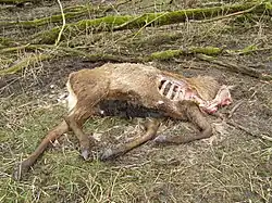 Kadaver eines geschwächten Hirsches, der geschossen wurde, um dem Tier unnötiges Leiden zu ersparen