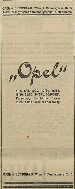 Kurz vor der Jahrhundertwende erkannte man, dass die Zukunft der Opel Werke nicht bei den Nähmaschinen liegen würde, und begann mit der Produktion von Fahrrädern und Automobilen. Ab 1899 wurde Opel & Beyschlag also offizieller Importeur für Opel Patent Motorwagen für Österreich-Ungarn. Opel & Beyschlag war somit die erste Vertretung von Opel außerhalb Deutschlands. 15 Jahre später konnten bereits 150 Opel Automobile auf Österreichs Straßen gezählt werden. Auch Otto Beyschlags Frau Therese beteiligte sich aktiv im Geschäft. Sie war eine der ersten anerkannten Automobilistinnen Österreich-Ungarns und forcierte die Zusammenarbeit mit Fahrschulen für Bekanntheit.[4]