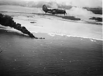 ![]() Eine Curtiss SB2C Helldiver über einem brennenden japanischen Tanker nahe der Küste Vietnams | |||||||||||||||