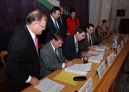 - ↑ U.S. commences $53 million humanitarian aid project in Uzbekistan. In: reliefweb.int. 22. August 2002, abgerufen am 22. April 2024.