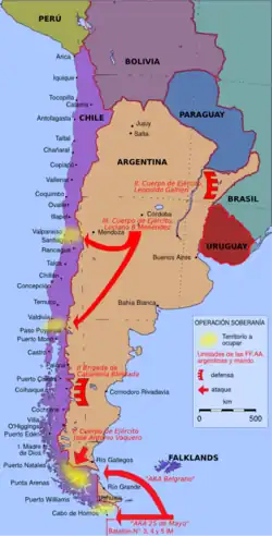 - III. Armeekorps unter dem Befehl von Luciano Benjamín Menéndez. Aufgabe: Von Mendoza aus in Chile eindringen und wenn möglich Santiago de Chile und Valparaíso militärisch besetzen.