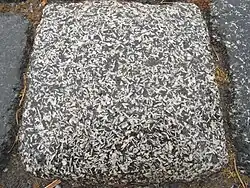 Ophitisches Gefüge der Feldspäte (weiß) in einem Pflasterstein aus Lausitzer Lamprophyr