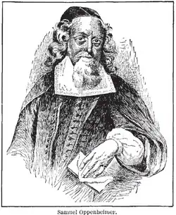 - Samuel Wolf Oppenheimer (* 21. Juni 1630 in Heidelberg; † 3. Mai 1703 in Wien), auch Samuel Heidelberg genannt, war ein Geldleiher, Armeelieferant, Hofverwalter und Diplomat.[11] Er ehelichte (II) Sandela Sentille Carcassonne, Tochter des Manoach Carcassonne von Mannheim.[12] Oppenheimers bis zu 20 % verzinsten Darlehen stellten den größten Posten unter den Schulden Österreichs nach dem Spanischen Erbfolgekrieg dar. Sie sollen sich auf ca. sechs Millionen Gulden belaufen haben, welche größtenteils über Dritte refinanziert waren. Nach dem Tod Oppenheimers entledigte sich Österreich dieser Schulden, indem es nicht zurückzahlte, sondern den Konkurs über den Nachlass verfügte. Die kaiserliche Konkurserklärung stürzte alle mit Oppenheimer in Verbindung stehenden Geldgeber und nachweislich auch die Frankfurter Börse in eine schwere Krise. Sein engster Vertrauter und Vertreter war Samson Wertheimer (1658–1724).[13]